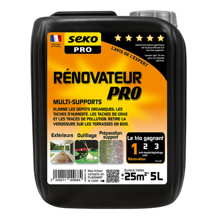 Le rénovateur de Seko Professionnel est une solution prête à l'emploi qui permet de désencrasser et désincruster en profondeur tous types de supports : Murs en briques, en pierres, en enduits, béton, mortier, fibre ciment, ardoises, tuiles, verre, plastiques, shingle, fibre-ciment, faïence, polyester, bois, supports-peints, etc.