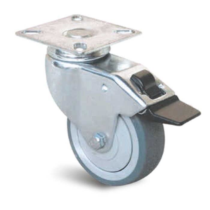Roulette sur monture acier avec fixation platine à frein. Cette roulette contient un galet en caoutchouc noir équipé de pare-fils rattaché à une platine pivotante sur roulement à billes.