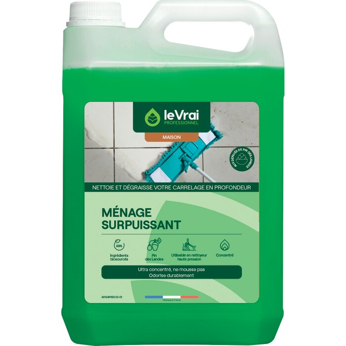 Le nettoyant multi-surfaces Le Vrai Professionnel est idéal pour nettoyer et dégraisser sans laisser de traces les meubles, vitres, écrans, miroirs, etc. Il contient 96,80 % d'ingrédients biosourcés et vous offre une puissante senteur fraîche de pin des Landes.