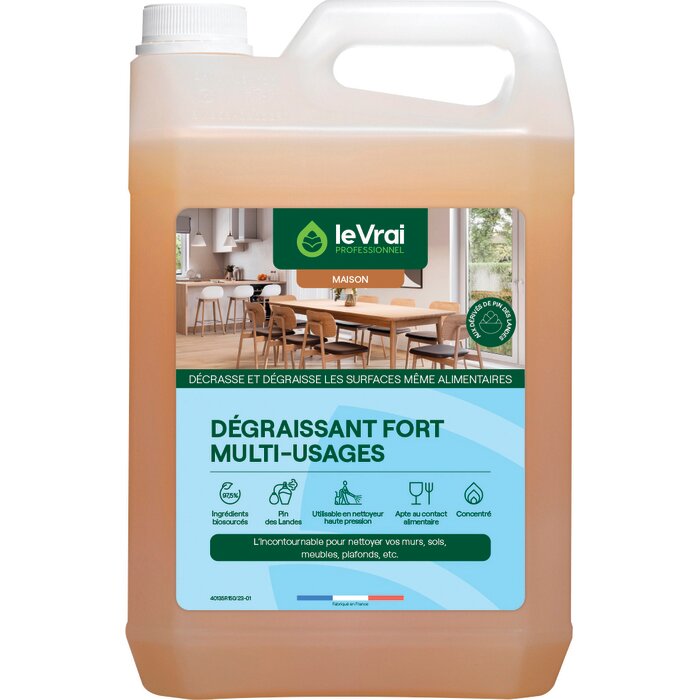 Le dégraissant désinfectant Le Vrai Professionnel à la formule biotechnologique et prête à l'emploi, est idéal pour nettoyer, dégraisser et désinfecter les surfaces de la cuisine. Il élimine 99,99% des germes sur les réfrigérateurs, micro-ondes, plans de travail, tables non sensibles aux acides, etc.