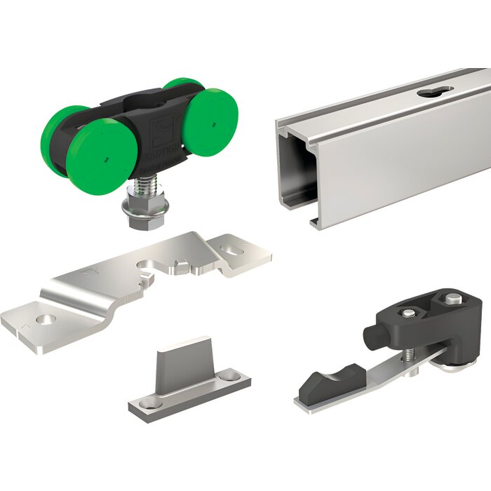 Ensemble de garniture complète conçue pour l'installation de portes coulissantes d'un poids maximal de 80 kg. Ce kit inclut un rail en aluminium brut de 1,65 mètres de longueur, pré-percé tous les 0,44 mètres pour une installation facilitée.